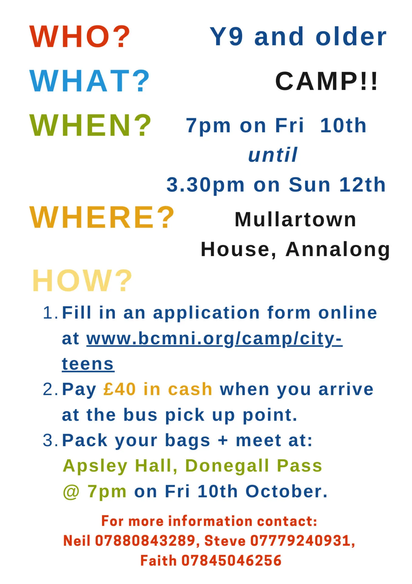 City Teens weekends take place 3 times per year, normally in September, February and June. These weekend camps are for young people from Yr9 upwards, many of whom have grown up through the City Kids’ camp. Most campers come from Belfast and the programme usually involves lots of activities, both on-site and off-site: for example, go-karting, minigolf, bowling, snowtubing, bingo. The Bible sessions often involve testimonies, or looking at what the Bible has to say about issues facing teenagers such as sexuality, alcohol, identity etc.